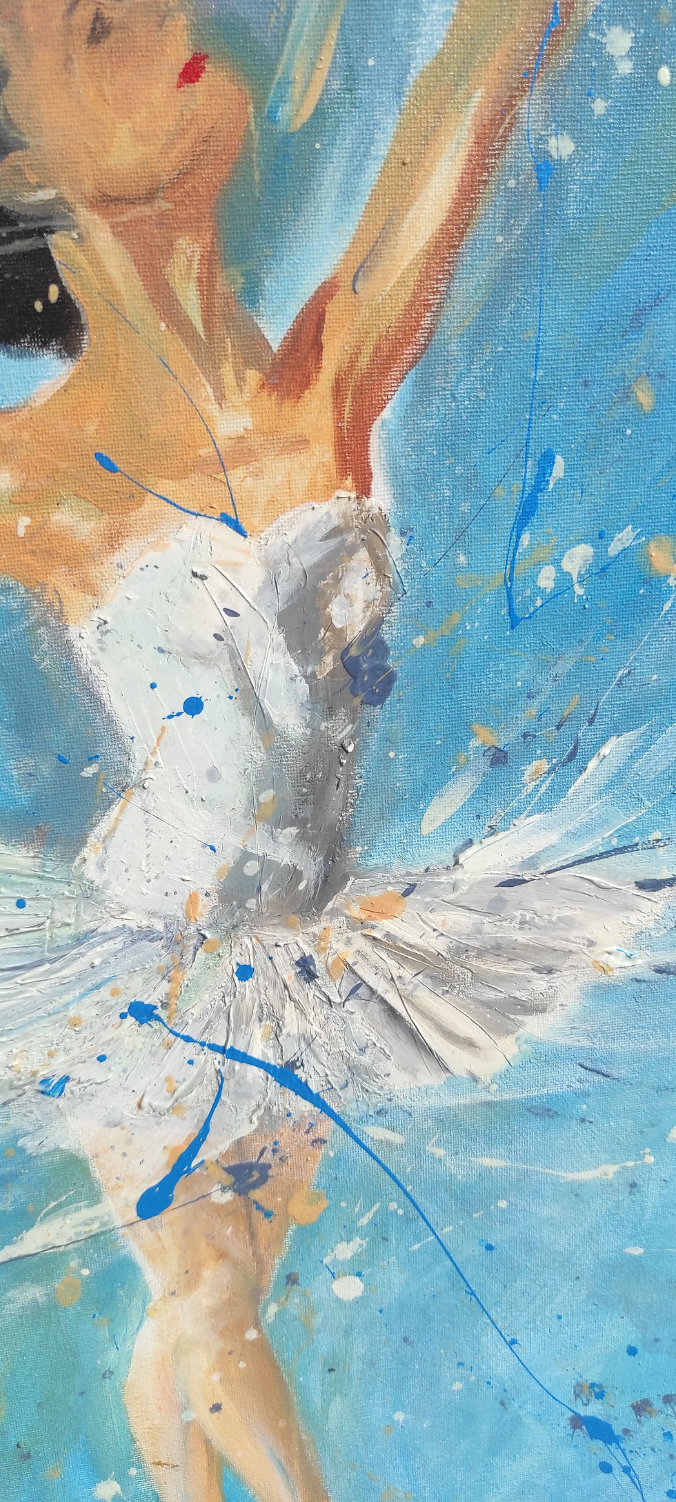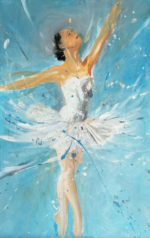 Il quadro rappresenta una ballerina bassa che danza fiera di se e persa nella sua danza. Senza rispettare le proporzioni riesce a non perdere in grazia e bellezza. La ballerina danza e la sua danza fa sognare. Il suo leggiadro volteggiare fa dimenticare l'imperfezione e lascia intravedere il sogno, nello sfondo celeste pieno di schizzi bianchi.