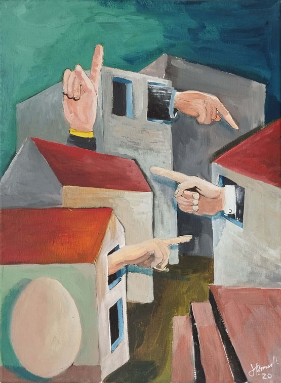 Il quadro rappresenta tante mani che spuntano da finestre delle case, mani che indicano e ciascuno indica una cosa diversa. Tra le case senza porte si vede un uovo, in piedi. Nel gioco della ricerca del colpevole, del responsabile di ciò che non ci piace, le voci si susseguono, si sprecano si moltiplicano e le mani che credono di indicare il vero responsabile si affrettano al responso. La case senza porte sono la chiusura mentale dentro la quale le nostre sicurezze rischiano di trincerarsi. In tutto questo rumore la vita continua e non si cura di tanto rumore: l'uovo resta fermo, in piedi.
